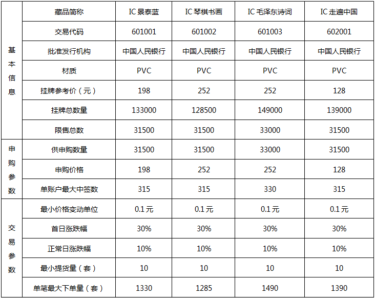 经湖南华强艺术品交易中心(以下称本中心)普通投资人会员申请,经纪会员推荐,本中心专家评审委员会、新品种挂牌审核小组评估审核通过,鉴定机构鉴定合格入库完毕,《IC景泰蓝》、《IC琴棋书画》、《IC毛泽东诗词》、《IC走遍中国》准予在本中心正式挂牌交易,具体事项公告如下: