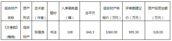 经《兰亭韵》(本名:楠尧)艺术品组合财产持有人申请,本中心审核通过,《兰亭韵》(本名:楠尧)艺术品组合财产(以下简称艺术品组合财产)准予在本中心正式挂牌交易,具体事项公告如下: