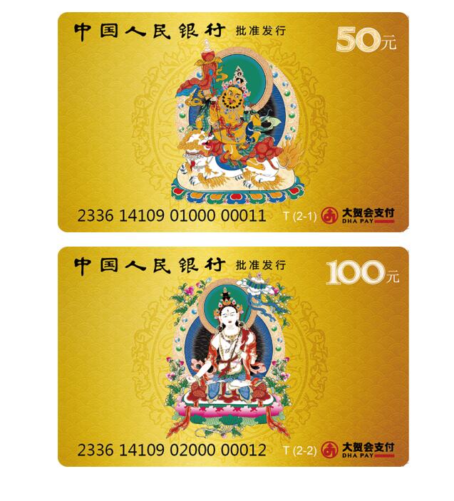 2014甲午新年,为宣传我国非物质文化遗产,纪念西藏施行民主改革55周年,以及祈福人民幸福安康、吉祥平安,经中国人民银行批准发行“艺术卡—唐卡系列”,全套2枚,合计面值150元。