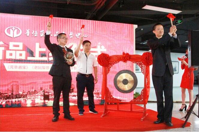 仪式现场,华强艺术品交易中心依次向《元丰通宝》、《老鼠娶亲》两支新产品的投资人代表颁发上市纪念奖杯,并共同敲响上线金锣,预祝两支新品上线长红,牛气冲天。