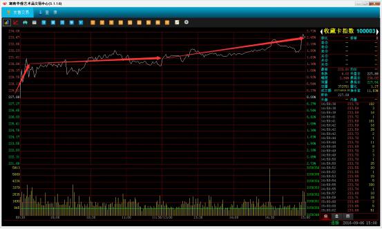 大盘解析:今日开盘综指受收藏卡板块冲高影响综指直接走高后受艺术品板块下行回落,维持红盘震荡,10:15附近触底反弹,进行红绿盘整理运行直至早盘收盘,午盘开盘指数受艺术品板块走低影响震荡下行回落, 14:30指数反弹冲高回落,尾盘受个票拉升指数缩小跌幅收跌0.12%。今日艺术品板块比收藏卡板块走势较弱,盘面在前期进行连涨后今日选择理性小幅回调,后市甄别个票进行大胆建仓强势个票。