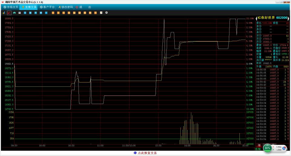 602006IC你好世界,全天宽幅震荡,开盘跌停,午盘过后向上拉升直至涨停,截止收盘涨停板处仍有不少封单,继上次连连破新高回调后,今日开始向上运行,后市建议持续关注。