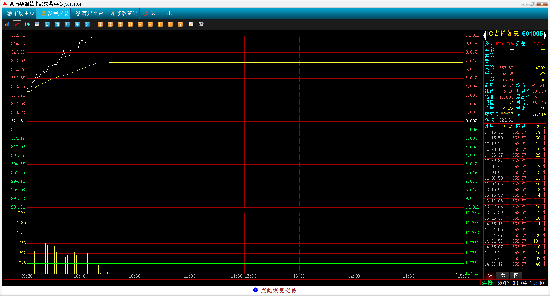 601005IC吉祥如意,前期连续数日回落后,今日高开,随后单边上行,十点过后涨停封板,涨停后外部抛出筹码不多,连续2日报收涨停,后市若能在该处企稳,建议逢低参与。