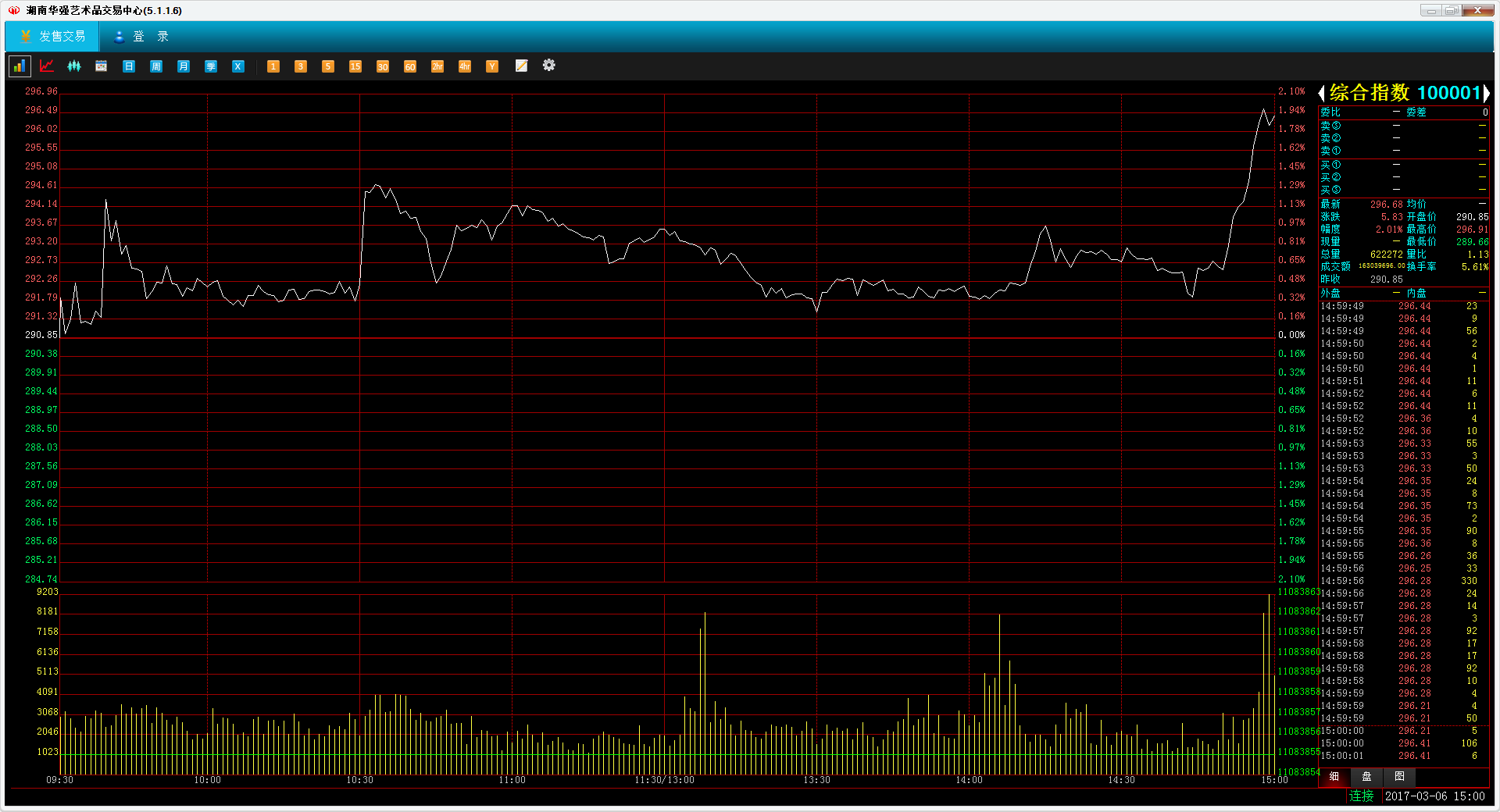今日市场走出震荡上行的行情。综合指数收于296.68点,涨2.01%,成交1.86亿元。艺术品指数收于72.65点,跌0.01%。收藏卡指数收于344.39点,涨4.14%。全市有16家上涨(1家涨停),有34家下跌(3跌停)。