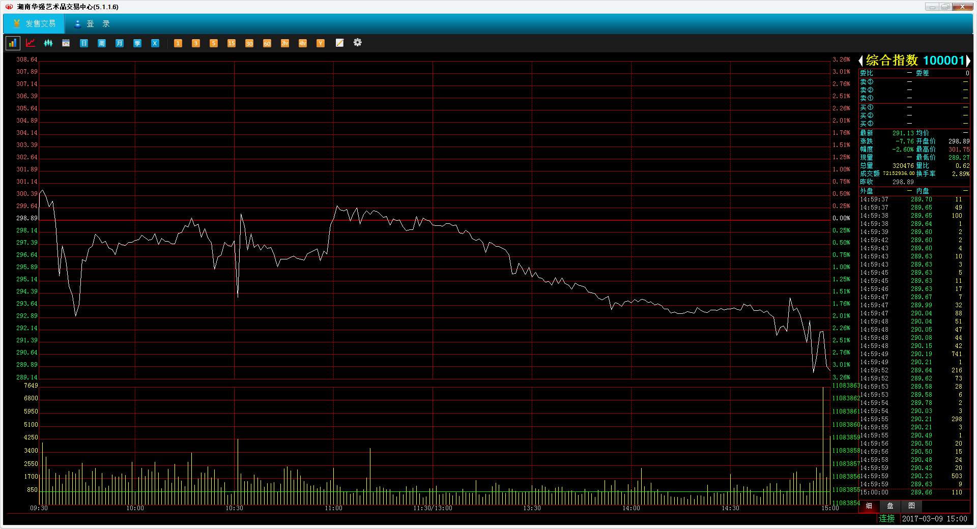 今日市场走出震荡下行的行情。综合指数收于291.13点,跌2.60%,成交0.87亿元。艺术品指数收于70.53点,跌2.37%。收藏卡指数收于345.24点,跌2.77%。全市有21家上涨(3家涨停),有27家下跌(3家跌停)。