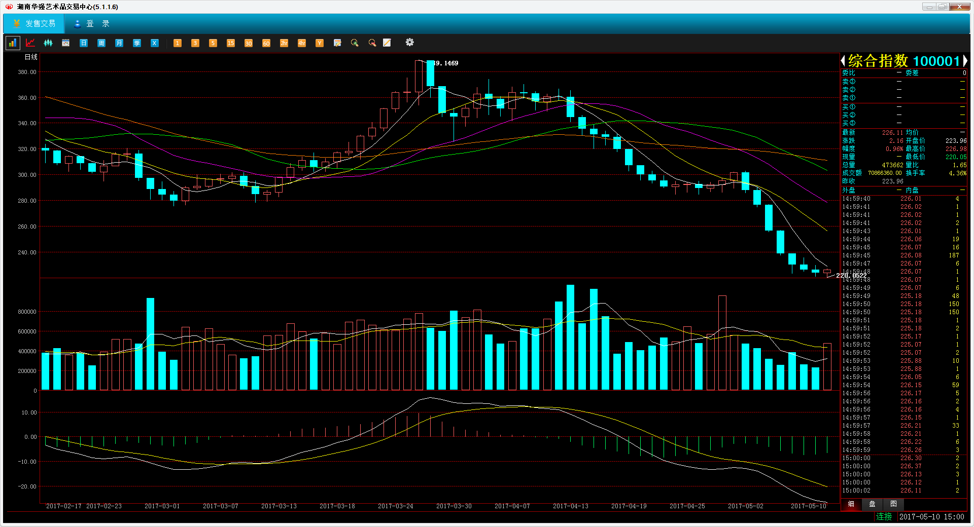 今日大盘走出小幅探底回升的行情。综合指数收于226.11点,涨0.96%,成交0.74亿元。艺术品指数收于44.39点,涨1.57%。收藏卡指数收于245.86点,涨1.01%。全市有27家上涨(5家涨停),有23家下跌(2家跌停)。
