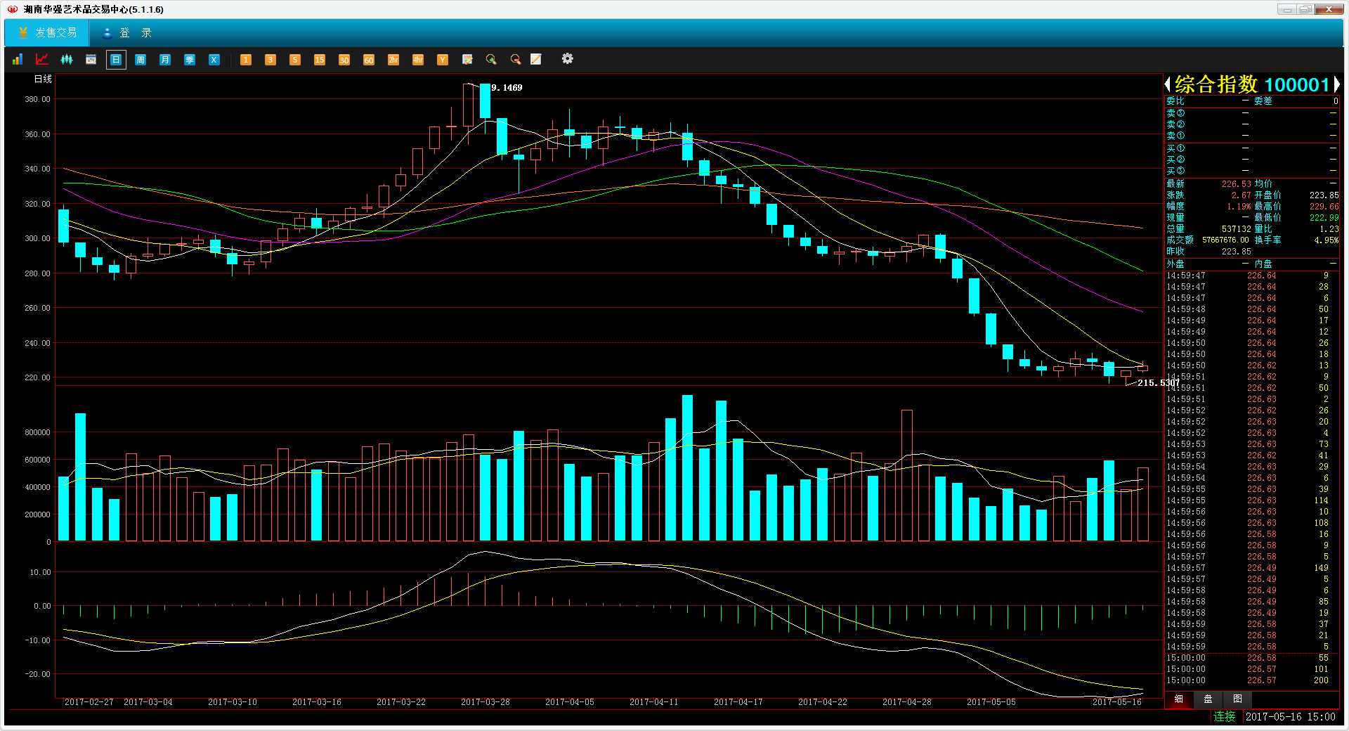 今日大盘走出小幅上涨的行情。综合指数收于226.53点,涨1.19%,成交0.63亿元。艺术品指数收于41.89点,跌2.32%。收藏卡指数收于248.43点,涨1.88%。全市有22家上涨(1家涨停),有29家下跌(3家跌停)。