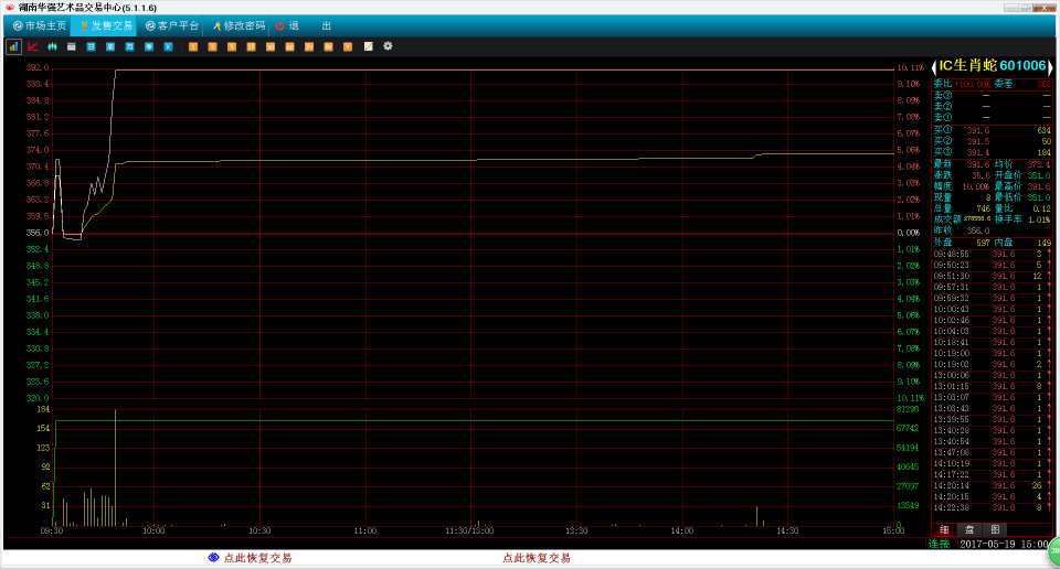 601006IC生肖蛇,开盘稍作调整后直接报收涨停,截止至收盘仍维持涨停,前期连续多日回调整理后,今日有企稳迹象,后市建议多作关注。