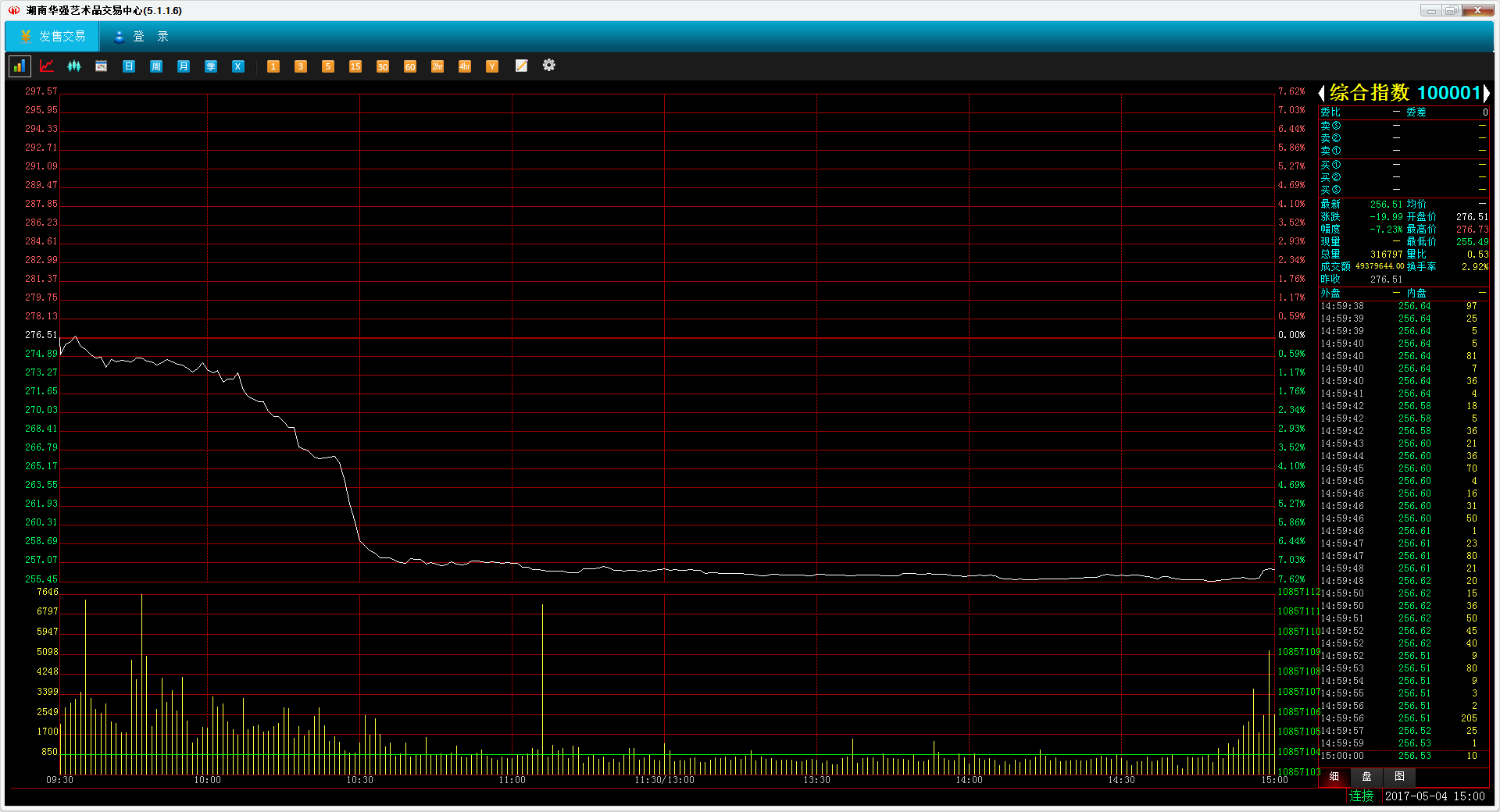 今日大盘走出逐步下行的行情。综合指数收于256.51点,跌7.23%,成交0.52亿元。艺术品指数收于50.16点,跌2.87%。收藏卡指数收于276.09点,跌8.33%。全市有7家上涨(1家涨停),有44家下跌(19家跌停)。